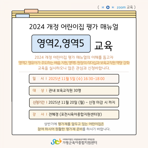 평가를 앞둔 어린이집은 교육에 참여 하시어 원활하게 준비하시기 바랍니다.