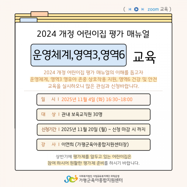 평가를 앞둔 어린이집은 교육에 참여 하시어 원활하게 준비하시기 바랍니다.