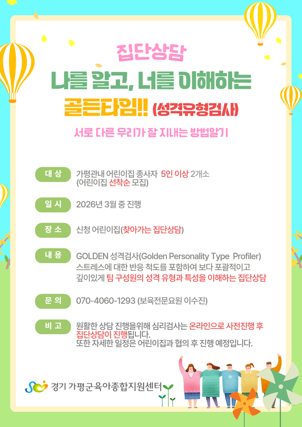 | 장소 | 신청어린이집(찾아가는 집단상담) | 대상 | 가평관내 어린이집 |