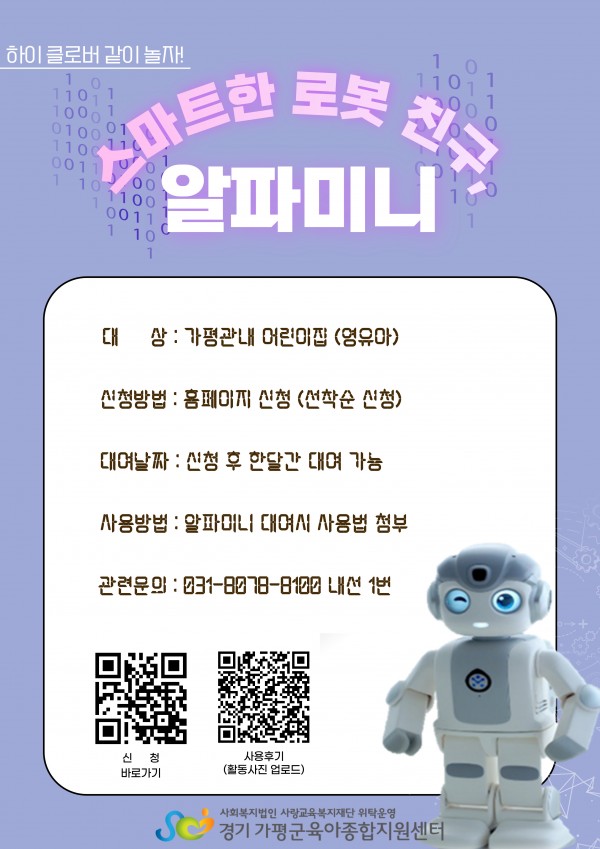 | 장소 | 알파미니를 대여하여 각 어린이집에서 활용가능 | 대상 | 가평관내 어린이집 |