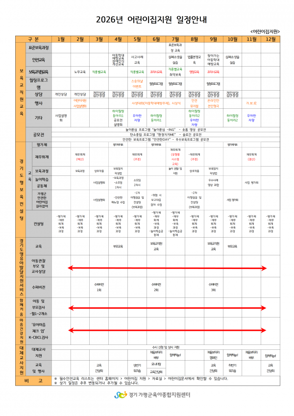 공지 -2026년 어린이집지원 연간 일정 안내- 페이지 정보 작성자 관리자 댓글 0건 조회 5회 작성일 26-03-10 11:09 목록 첨부파일 0.26년 어린이집지원 연간 일정게시용.pdf (51.7K) 1회 다운로드 | DATE : 2026-03-10 11:09:09 본문 2026년 어린이집지원 연간 일정 안내드리오니,이용에 참고하시기 바랍니다. ^-^((출력 시, 상단 첨부 된 파일을 다운로드 후 활용 하시기 바랍니다.아래 이미지를 클릭 하시면 크게 보입니다.))문 의보육교직원 교육 070-4060-1293보육 컨설팅 070-4060-1849아동관찰 및 상담 031) 8078-8100 (내선5)대체교사지원 070-4060-1294 다음글2월 4일 진행하는 인사노무교육 자료안내 26.02.02
