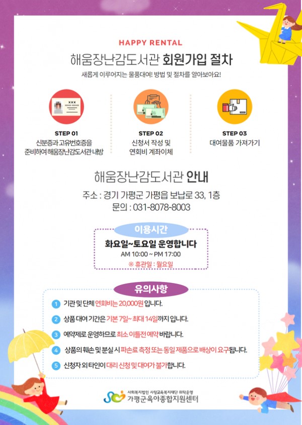 기타 어린이집 물품대여사업 변경 안내 페이지 정보 작성자 관리자 댓글 0건 조회 1,979회 작성일 25-02-05 16:26 목록 본문 대여사업은 원장님 대표로 회원가입이 가능하며,이용문의는 031-8078-8003으로 연락주시기바랍니다.또한 아래의 안내문을 확인하시어,어린이집 대여물품 사업을 이용하시기바랍니다.감사합니다. 이전글아이지키ME 피켓 다운로드 안내 25.02.24 다음글-2025년 어린이집지원 연간 일정 안내- 25.02.05