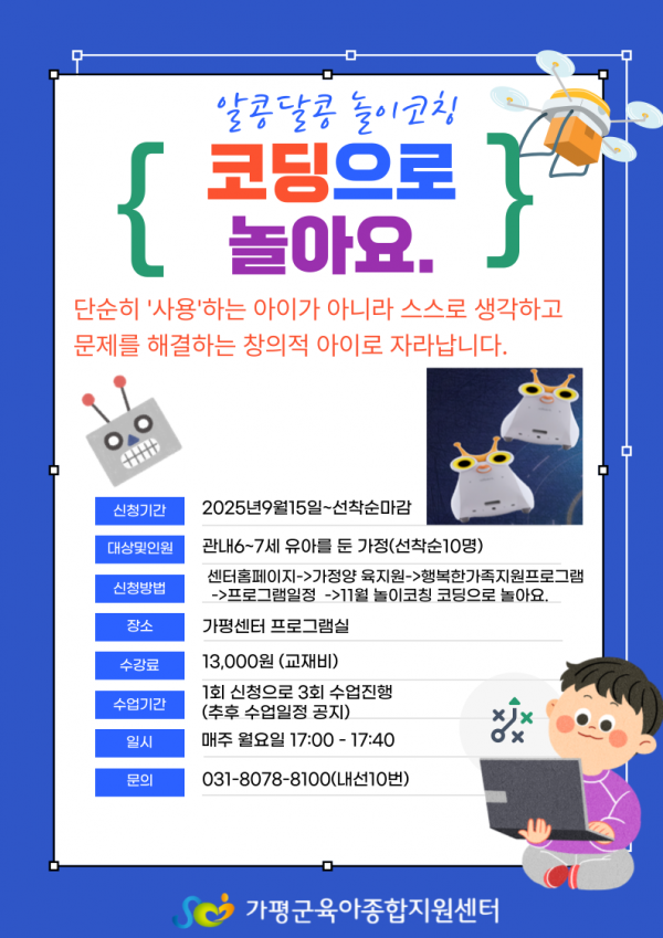 | 장소 | 센터 내 프로그램실 | 대상 | 관내 6~7세 유아를 둔 가정 |