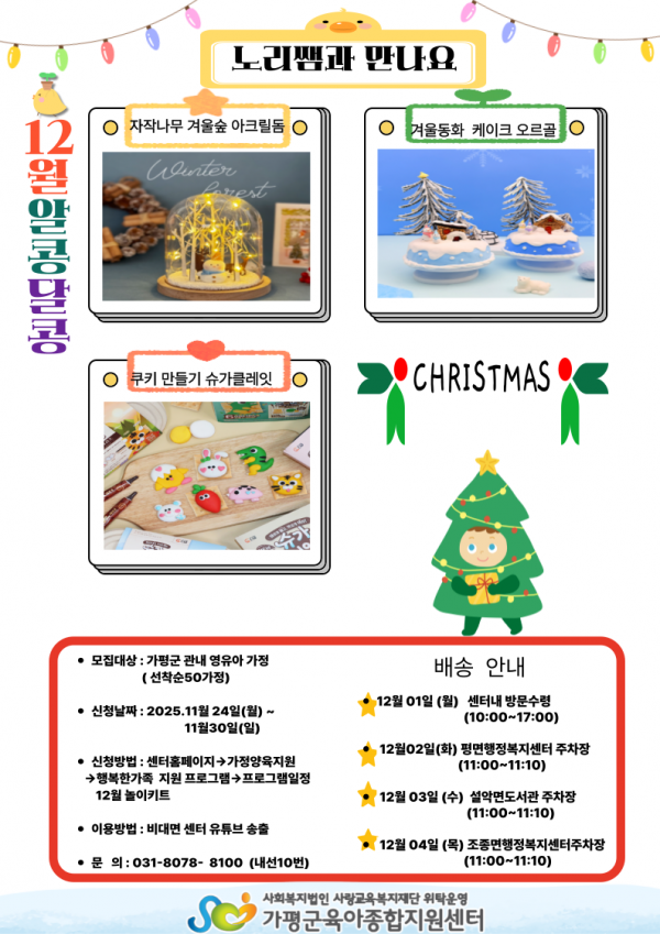 | 장소 | 센터 내 도담놀이터 개별수령 및 각 지역 배송 | 대상 | 가평관내 영유아 가정 |
