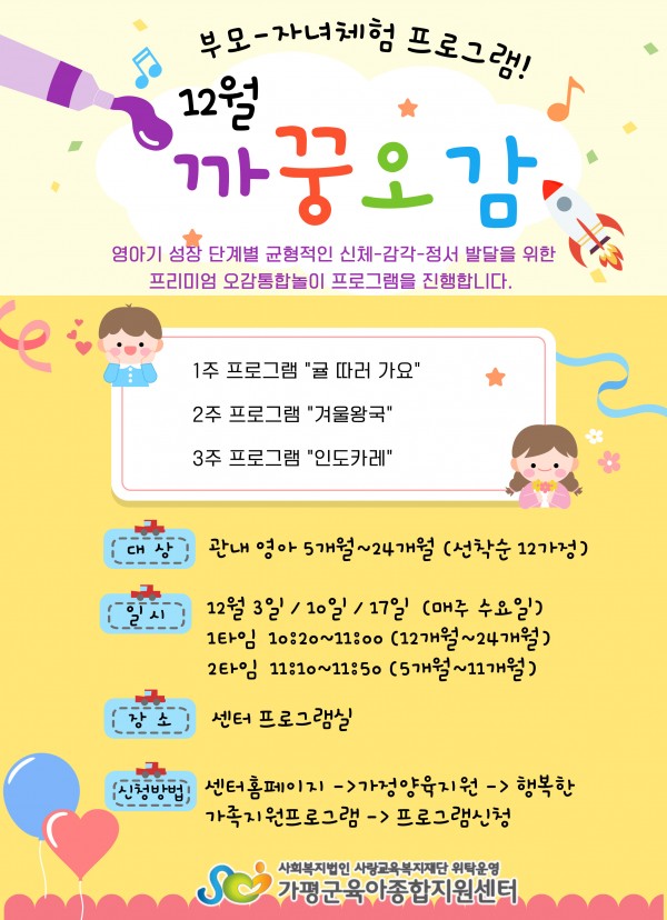 | 장소 | 센터 프로그램실 | 대상 | 관내 영아 12개월~24개월 및 부모 |