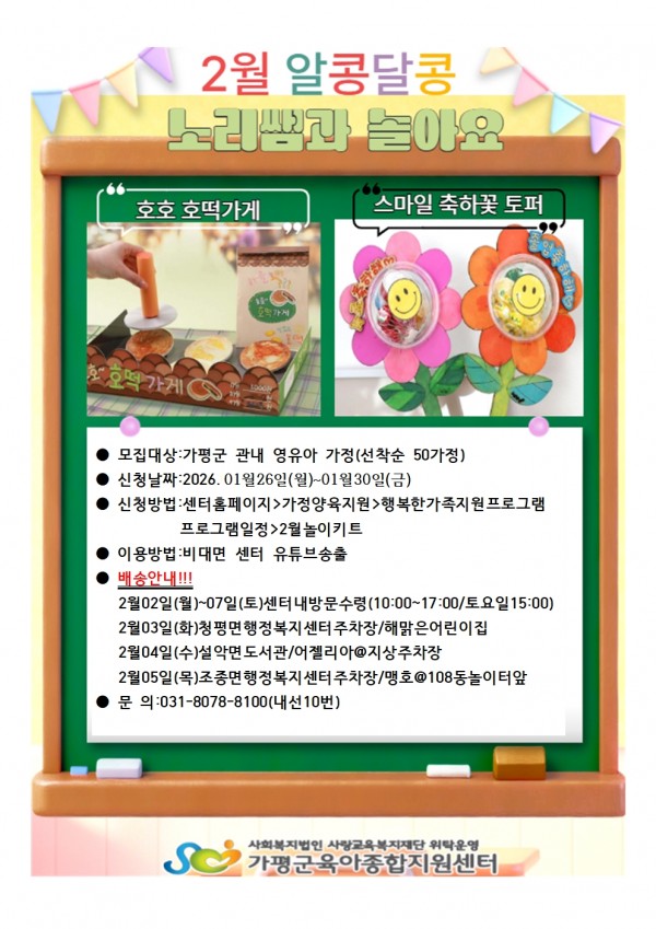 | 장소 | 센터 내 도담놀이터 개별수령 및 각 지역 배송 | 대상 | 가평관내 영유아 가정 |