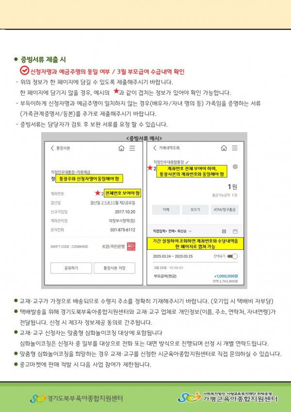 ▷증빙서류 : 부모급여 및 양육수당 수급 통장 내역, 개인정보동의서,놀이코칭기본필수교육