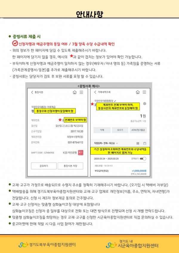 ▷증빙서류 : 부모급여 및 양육수당 수급 통장 내역, 개인정보동의서,놀이코칭기본필수교육