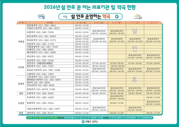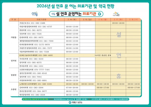 2026년 설 연휴 문 여는 의료기관 및 약국 안내 페이지 정보 작성자 관리자 댓글 0건 조회 12회 작성일 26-02-06 16:25 목록 관련링크 https://www.gp.go.kr/health/selectBbsNttView.do?key=257&bbsNo=150&nttN… 6회 연결 본문 * 설연휴 문여는 의료기관 및 약국출처: 가평보건소 이전글[건강포커스] "'화목한 가족 식사'가 청소년 음주·흡연 등 위험 낮춘다" 26.02.06 다음글배우자 출산前 임신때도 아빠휴가 쓸수 있다…유산해도 5일 휴가 26.02.06