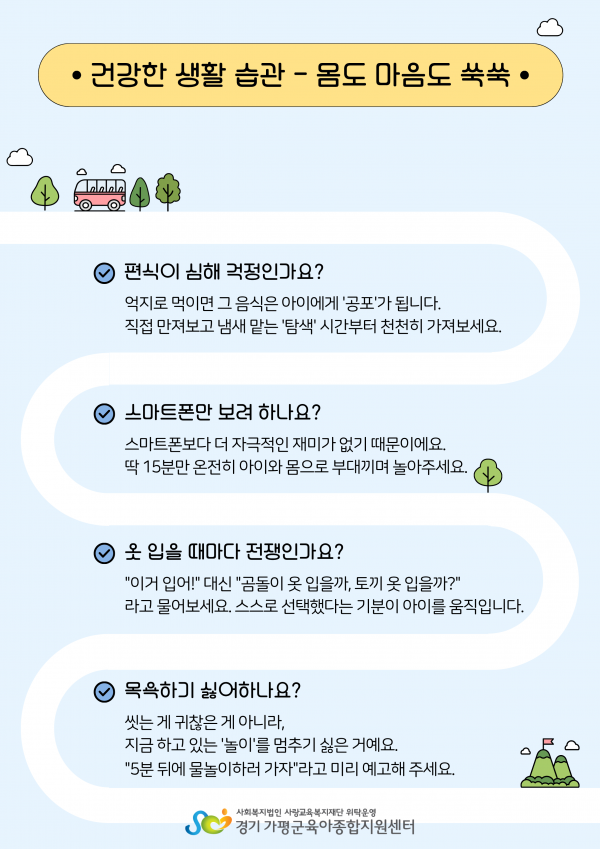부모님과 선생님들의 깊은 고민에 작은 쉼표가 되어드리고자, 센터에 게시되어있던 '육아 팁'을 홈페이지에 소개해 드립니다. 아이의 행동 뒤에 숨겨진 진짜 속마음을 들여다보는 시간! 완벽한 부모가 아니어도 괜찮습니다. 오늘 하루도 아이와 함께 성장하고 있는 여러분을 진심으로 응원합니다.
