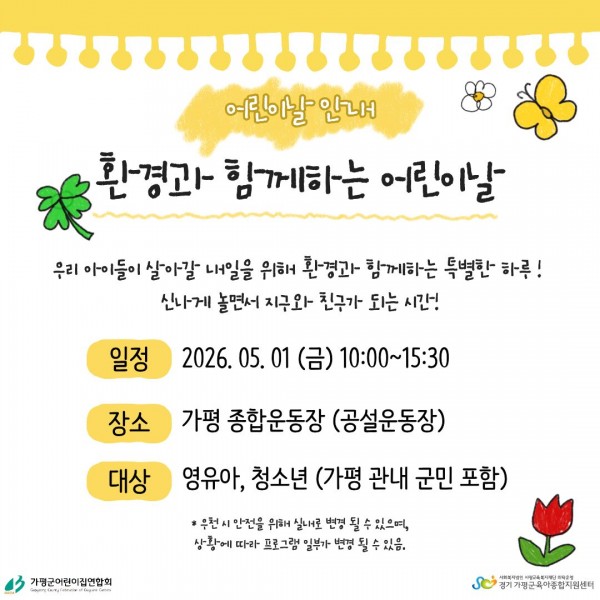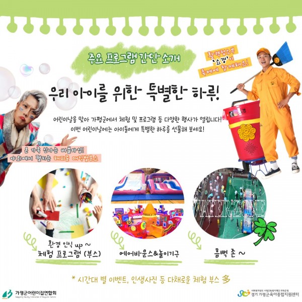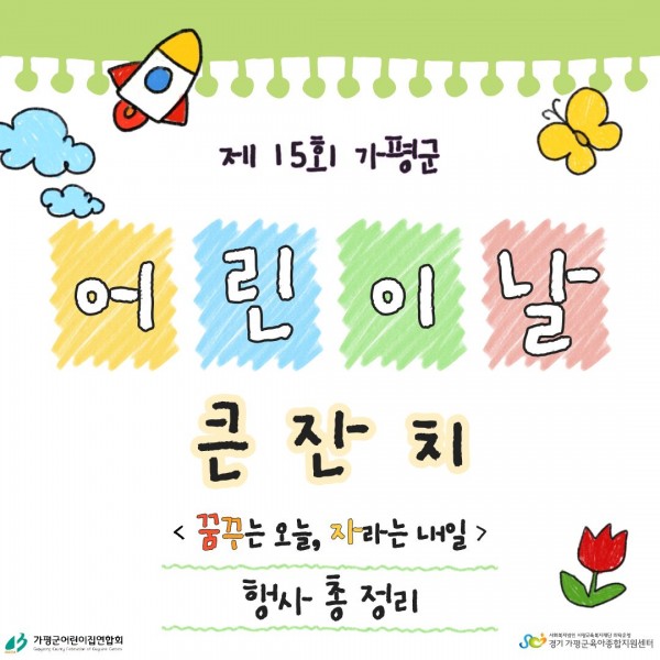 공지 -제 15회 가평군 어린이날 큰잔치 (꿈꾸는 오늘, 자라는 내일) 행사 안내- 페이지 정보 작성자 관리자 댓글 0건 조회 204회 작성일 26-03-23 17:37 목록 본문 제 15회 가평군 어린이날 큰 잔치 안내 다음글[센터직원채용]가평군육아종합지원센터 영유아발달지원 사업 비상근인력 채용 공고 26.03.20