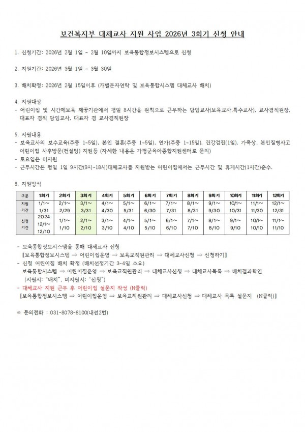 센터 대체교사 지원 사업 2026년 3회기 신청 안내 페이지 정보 작성자 관리자 댓글 0건 조회 6회 작성일 26-01-30 19:41 목록 본문 화면을 클릭하시면 크게 보실 수 있습니다 다음글[센터직원채용]가평군육아종합지원센터 (대체교사 관리자) 최종 합격자 안내 26.01.30