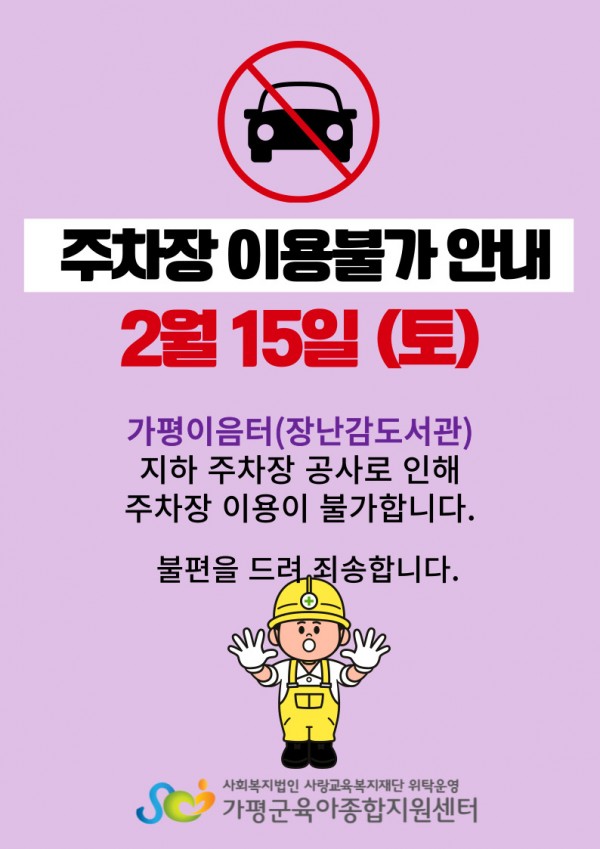 센터 2월 15일 해움장난감도서관 주차불가 안내 페이지 정보 작성자 관리자 댓글 0건 조회 2,799회 작성일 25-02-14 17:18 목록 본문 안녕하세요 해움장난감도서관입니다.가평이음터 지하주차장 공사관계로 2월 15일(토) 지하주차장 주차가 불가합니다.장난감도서관 이용자께서는 이용에 참고하시기 바랍니다.감사합니다. 이전글3월 휴관 안내 25.02.27 다음글[키드키즈 평생교육원]온라인특별직무연수교육 2025년 3월 기수 안내 25.02.12