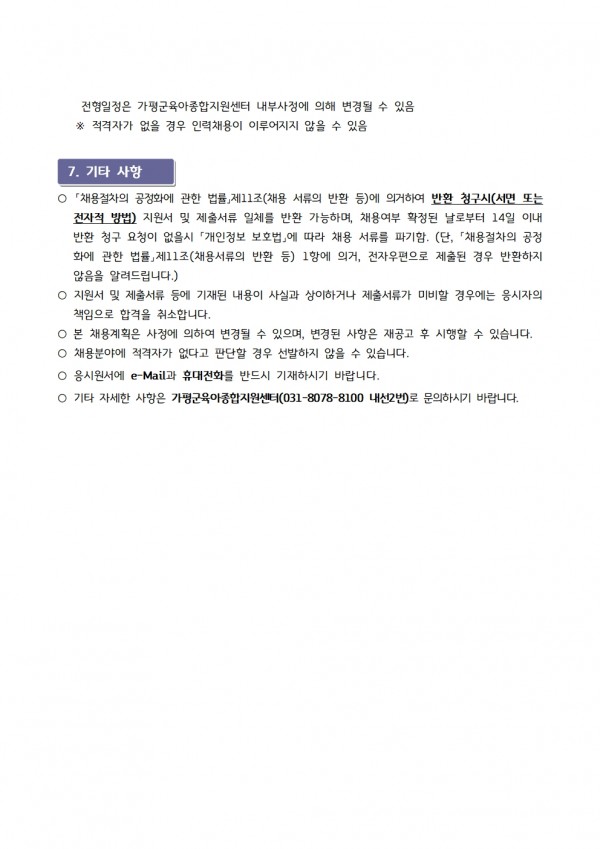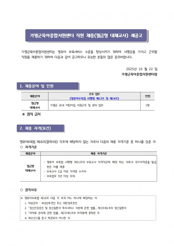 센터 [센터직원채용]가평군육아종합지원센터 직원채용(월급형 대체교사) 재공고 페이지 정보 작성자 관리자 댓글 0건 조회 587회 작성일 25-08-21 16:34 목록 첨부파일 입사지원서.hwp (46.0K) 21회 다운로드 | DATE : 2025-08-21 16:34:25 본문 ☞ 센터 직원 채용에 많은 관심과 응시 바랍니다 ※ 지원양식은 첨부파일을 다운로드 하시어 작성하시면 됩니다. ※ 안내문을 클릭하시면 크게 보실 수 있습니다 이전글[센터직원채용] 가평군육아종합지원센터 (대체교사) 서류전형 합격자 발표 25.08.28 다음글[센터직원채용]가평군육아종합지원센터 영유아발달지원 사업 비상근인력 및 언어치료사 채용연장 공고 25.08.20