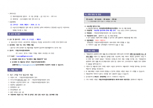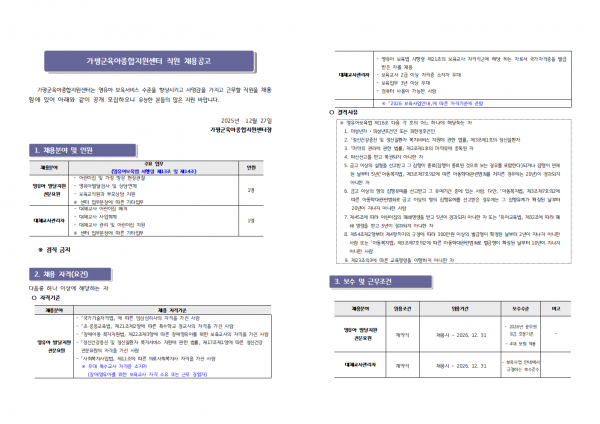 센터 [센터직원채용]가평군육아종합지원센터 직원채용(영유아발달지원 전문요원, 대체교사관리자) 채용공고 페이지 정보 작성자 관리자 댓글 0건 조회 242회 작성일 25-12-23 17:12 목록 첨부파일 가평군육아종합지원센터 입사지원서.hwp (21.0K) 21회 다운로드 | DATE : 2025-12-23 17:12:47 본문 ☞ 센터 직원 채용에 많은 관심과 응시 바랍니다 ※ 지원양식은 첨부파일을 다운로드 하시어 작성하시면 됩니다. ※ 안내문을 클릭하시면 크게 보실 수 있습니다 이전글2026 새해 인사 25.12.31 다음글2025 하반기(7월~12월) 이용자 만족도 조사 참여 안내 (가정양육지원사업) 25.12.22