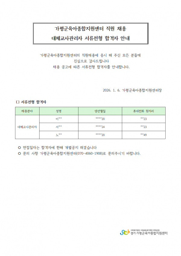 센터 [센터직원채용] 가평군육아종합지원센터 (대체교사관리자) 서류전형 합격자 발표 페이지 정보 작성자 관리자 댓글 0건 조회 92회 작성일 26-01-06 17:23 목록 본문 ☞파일을 클릭하시면 크게 보실 수 있습니다센터 직원 채용에 응시해 주신 모든 분들께 감사드립니다서류전형 합격자 명단 안내입니다 이전글- 2025 가정양육지원 하반기 이용자 만족도 조사 결과 안내 - 26.01.06 다음글대체교사 지원 사업 2026년 2회기 신청 안내 26.01.05