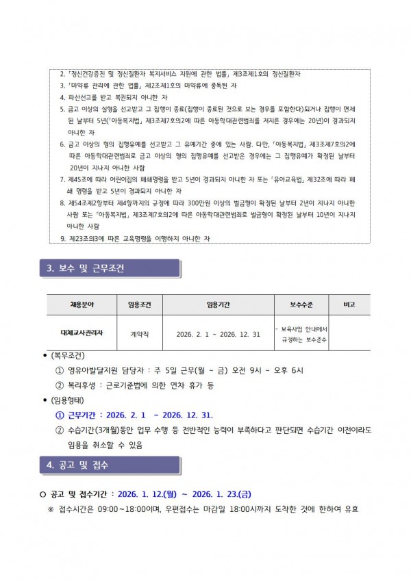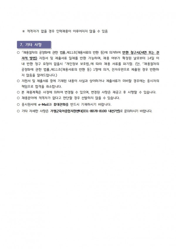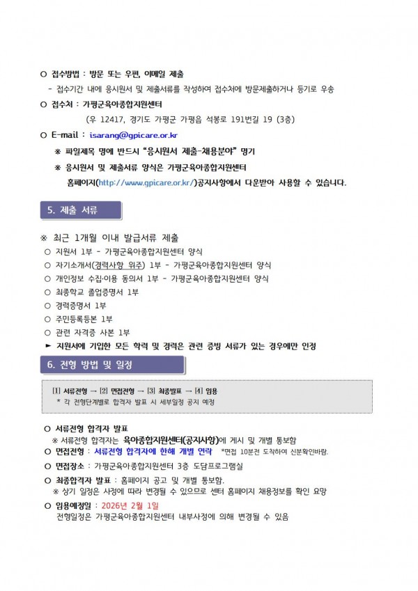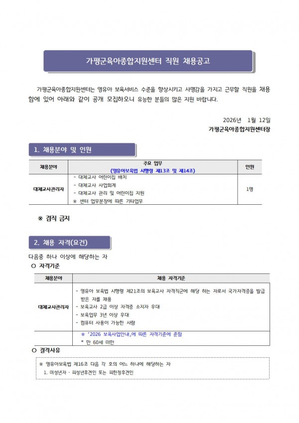 센터 [센터직원채용]가평군육아종합지원센터 직원채용(대체교사관리자) 채용공고 페이지 정보 작성자 관리자 댓글 0건 조회 30회 작성일 26-01-12 17:56 목록 첨부파일 입사지원서.hwp (21.0K) 2회 다운로드 | DATE : 2026-01-12 17:56:30 본문 ☞ 센터 직원 채용에 많은 관심과 응시 바랍니다 ※ 지원양식은 첨부파일을 다운로드 하시어 작성하시면 됩니다. ※ 안내문을 클릭하시면 크게 보실 수 있습니다 다음글[센터직원채용]가평군육아종합지원센터 대체교사 관리자 최종 합격자 안내 26.01.12