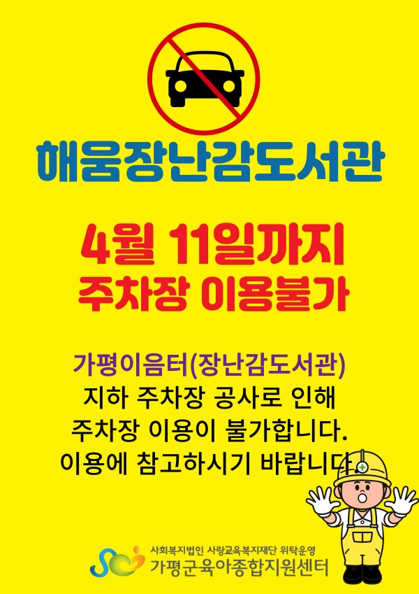 센터 [해움장난감도서관] 4월 11일(토)까지 지하주차장 이용불가 안내_ 기간연장 페이지 정보 작성자 관리자 댓글 0건 조회 78회 작성일 26-04-01 18:19 목록 본문 [해움장난감도서관]가평이음터 지하주차장 공사로 인하여 4월 11일(토)까지 지하주차장 이용이 불가합니다.이점 참고하시어 이용바랍니다. 이전글아이사랑도담놀이터 4월 휴관안내 26.04.02 다음글경기도 영유아 교재교구 배달서비스 가정보육(24~35개월) 26.04.01