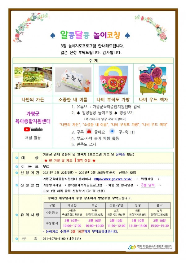 센터 알콩달콩 놀이코칭 3월 프로그램 안내 페이지 정보 작성자 관리자 댓글 0건 조회 17,265회 작성일 21-02-19 15:04 목록 본문 ♠ 알콩달콩 놀이코칭 ♠3월 놀이지도프로그램 안내해드립니다. 안내문에 나와있는 수령장소와 시간을 숙지하시어 키트수령해주시길 바랍니다.센터에서는 해움장난감도서관을 운영하고 있습니다.키트 수령시 회원가입을 원하시는 가정에서는 센터로 연락 바랍니다.www.gpicare.or.kr031-8078-8100센터 유튜브 바로가기↓↓↓↓↓↓↓↓↓↓↓https://www.youtube.com/channel/UC0SVH5izMSuTrPPdr8Vgg2g 이전글[센터직원채용] 가평군육아종합지원센터 보육전무요원 채용에 따른 서류전형 합격자 명단 안내 21.02.26 다음글비대면 "두근두근 우리아이 적응을 위한 감정코칭" 21.02.18
