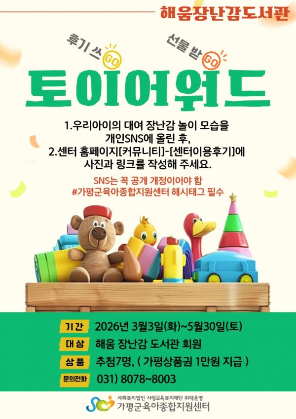센터 2026 상반기 토이어워드~!!가 시작됐어요. 페이지 정보 작성자 관리자 댓글 0건 조회 78회 작성일 26-03-11 13:37 목록 게시판 리스트 옵션 검색 본문 후기쓰GO! 선물받GO! 우리아이 노는 모습 함께 나눠요. 이전글[센터직원채용]가평군육아종합지원센터 직원채용(놀이지도사) 채용공고 26.03.11 다음글2026년 상반기 플리마켓 개최 26.03.10
