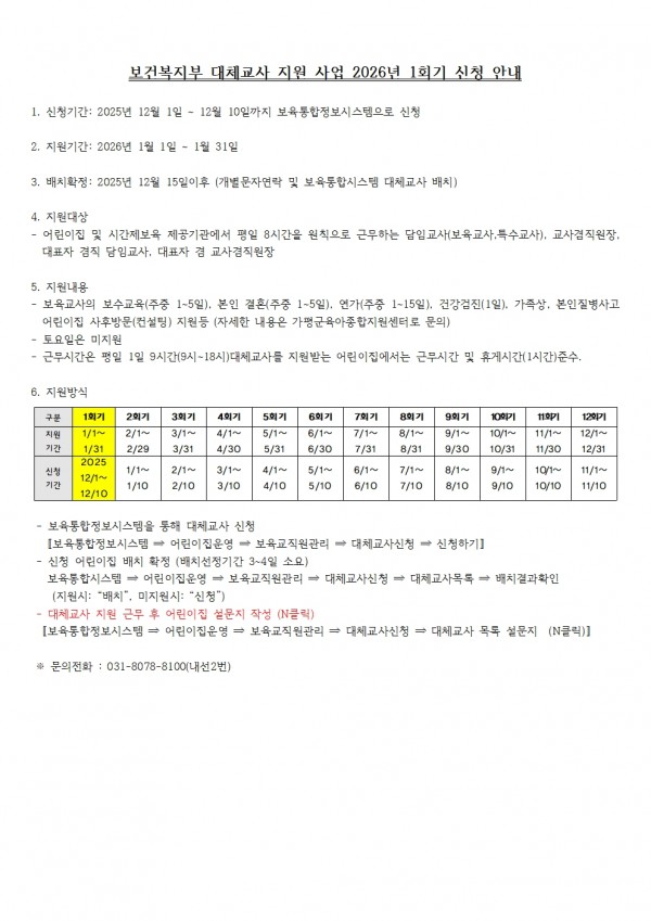 센터 보건복지부 대체교사 지원 사업 2026년 1회기 신청 안내 페이지 정보 작성자 관리자 댓글 0건 조회 12회 작성일 25-12-02 15:47 목록 본문 화면을 클릭하시면 크게 보실 수 있습니다 다음글해움 장난감 도서관 (전문 업체 소독 안내) 25.11.22