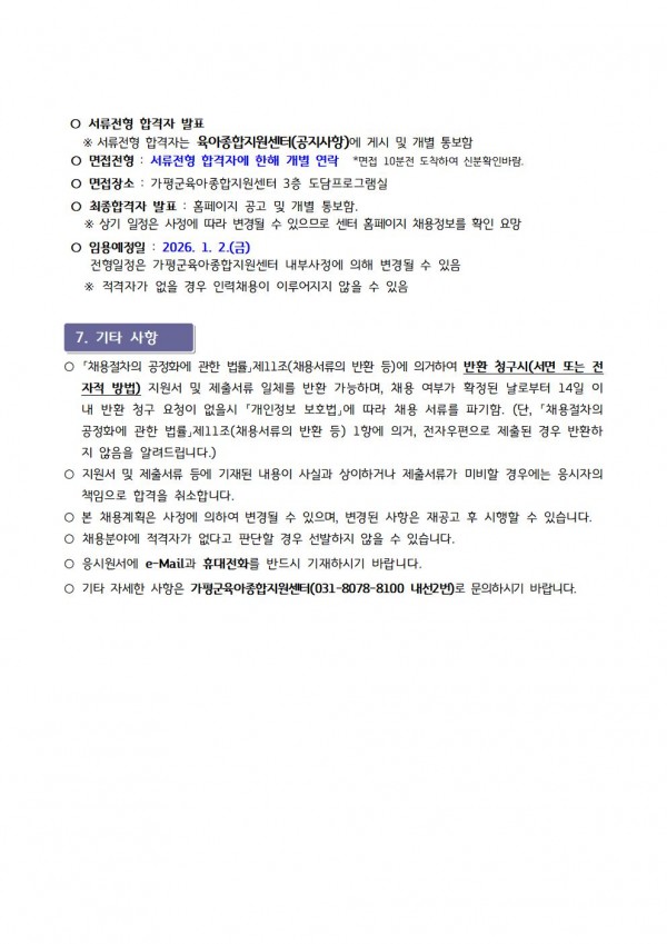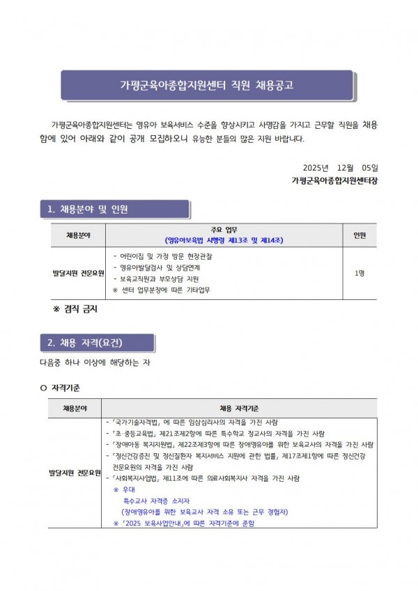 센터 [센터직원채용]가평군육아종합지원센터 직원채용(발달지원 전문요원) 공고 페이지 정보 작성자 관리자 댓글 0건 조회 21회 작성일 25-12-12 15:03 목록 첨부파일 가평군육아종합지원센터 발달지원 전문요원 입사지원서.hwp (32.0K) 6회 다운로드 | DATE : 2025-12-12 15:13:09 본문 ☞ 센터 직원 채용에 많은 관심과 응시 바랍니다 ※ 지원양식은 첨부파일을 다운로드 하시어 작성하시면 됩니다. ※ 안내문을 클릭하시면 크게 보실 수 있습니다 다음글아이사랑 도담 놀이터 휴관안내 25.12.12