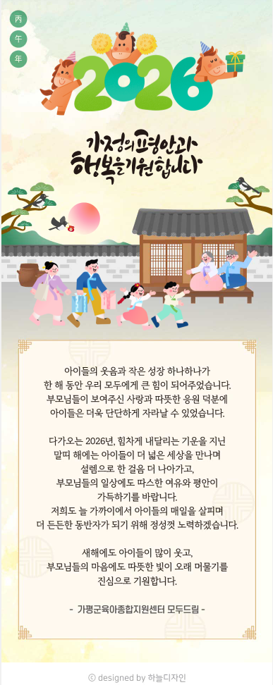 센터 2026 새해 인사 페이지 정보 작성자 관리자 댓글 0건 조회 22회 작성일 25-12-31 17:20 목록 본문 2026년 새해 복 많이 받으세요~ 다음글[센터직원채용]가평군육아종합지원센터 직원채용(영유아발달지원 전문요원, 대체교사관리자) 채용공고 25.12.23