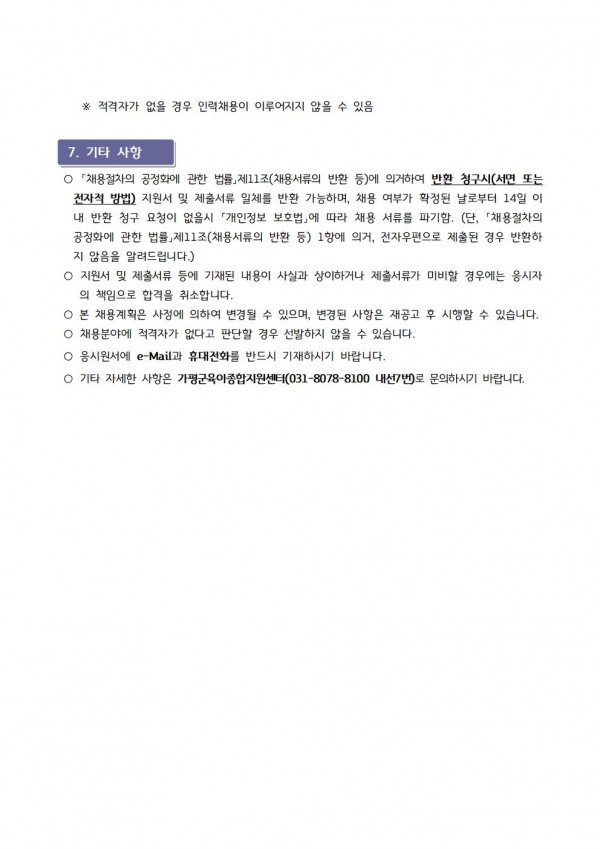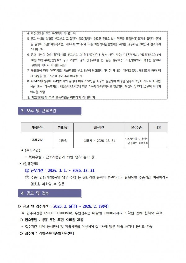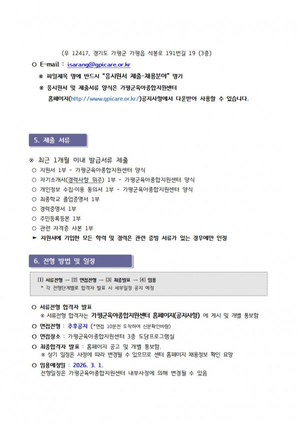 센터 [센터직원채용]가평군육아종합지원센터 직원채용(대체교사) 채용공고 페이지 정보 작성자 관리자 댓글 0건 조회 27회 작성일 26-02-06 11:44 목록 첨부파일 입사지원서.hwp (21.0K) 2회 다운로드 | DATE : 2026-02-06 11:44:50 본문 ☞ 센터 직원 채용에 많은 관심과 응시 바랍니다 ※ 지원양식은 첨부파일을 다운로드 하시어 작성하시면 됩니다. ※ 안내문을 클릭하시면 크게 보실 수 있습니다 다음글아껴쓰고 나눠쓰고 토이바다 26.02.05