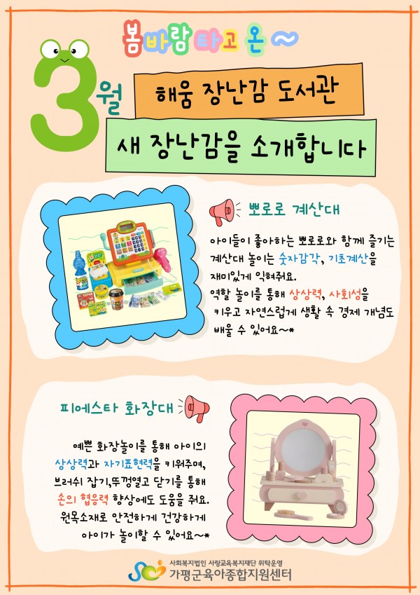 센터 3월 장난감을 소개합니다. 페이지 정보 작성자 관리자 댓글 0건 조회 9회 작성일 26-02-28 17:59 목록 본문 봄바람 타고 온 3월의 신규 장난감을 만나보세요~ 다음글아이사랑도담놀이터 스탬프투어를 시작합니다~ 26.02.27