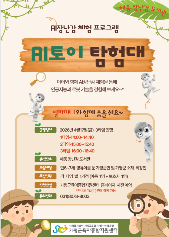 센터 4월 체험 프로그램!! [AI 토이 탐험대] 페이지 정보 작성자 관리자 댓글 0건 조회 11회 작성일 26-03-18 13:21 목록 본문 아이와 함께 AI 장난감 체험을 만나보세요! 다음글[가평군육아종합지원센터] 일급형조리사 모집안내 26.03.18