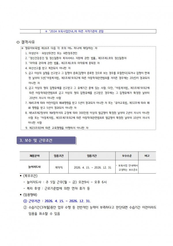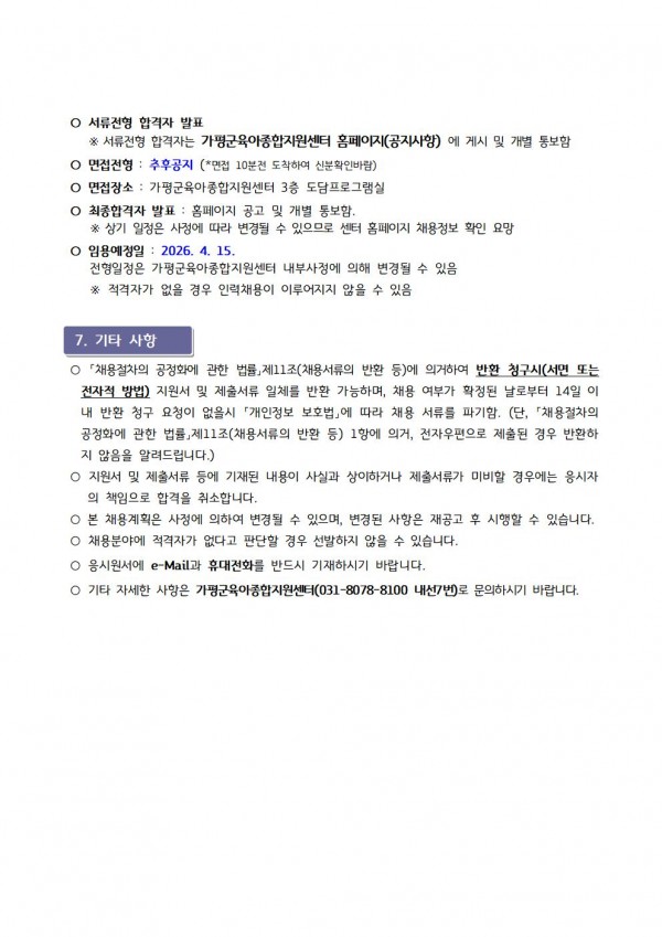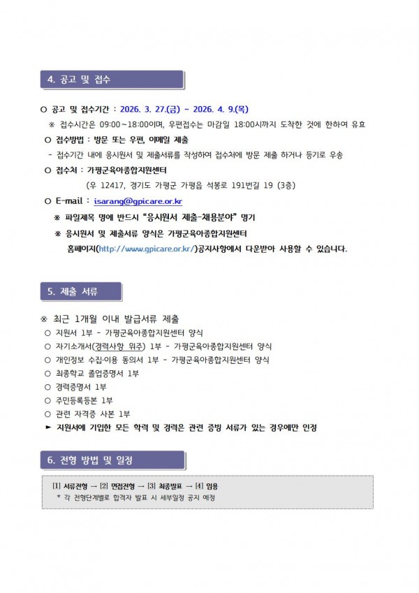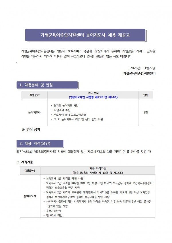 센터 [센터직원채용]가평군육아종합지원센터 직원채용(놀이지도사) 채용 재공고 페이지 정보 작성자 관리자 댓글 0건 조회 12회 작성일 26-03-27 13:38 목록 첨부파일 입사지원서.hwp (21.0K) 1회 다운로드 | DATE : 2026-03-27 13:38:55 본문 ☞ 센터 직원 채용에 많은 관심과 응시 바랍니다 ※ 지원양식은 첨부파일을 다운로드 하시어 작성하시면 됩니다. ※ 안내문을 클릭하시면 크게 보실 수 있습니다 이전글4월 장난감을 소개합니다 26.03.27 다음글- 제14회 줍깅 캠페인 실시 안내 - 26.03.25