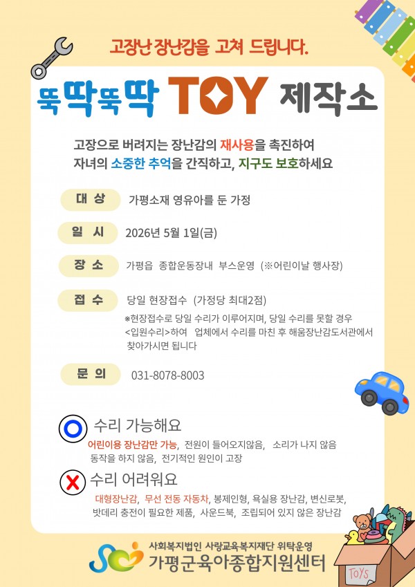센터 26년 상반기 토이제작소 (장난감무료수리) -5월1일행사 페이지 정보 작성자 관리자 댓글 0건 조회 9회 작성일 26-04-16 15:11 목록 본문 2026년 상반기 토이제작소 (*장난감무료수리)□ 일시 : 2026년 5월 1일(토)□ 장소 : 가평읍 종합운동장 (어린이날 행사 부스)□ 접수 : 2026년 5월 1일 당일 현장접수 (가정당 최대2점)□ 참고사항 - 수리 가능/불가능 장난감을 확인하신 후 접수해 주세요. - 현장접수로 당일 수리가 이루어지며, 당일 수리를 못할 경우 <입원수리>로 업체에서 수리를 마친 후 해움장난감도서관에서 찾아가시면 됩니다. 다음글2026년 경기도 영유아 교재교구 배달서비스 개인정보 동의서(변경양식) 26.04.16