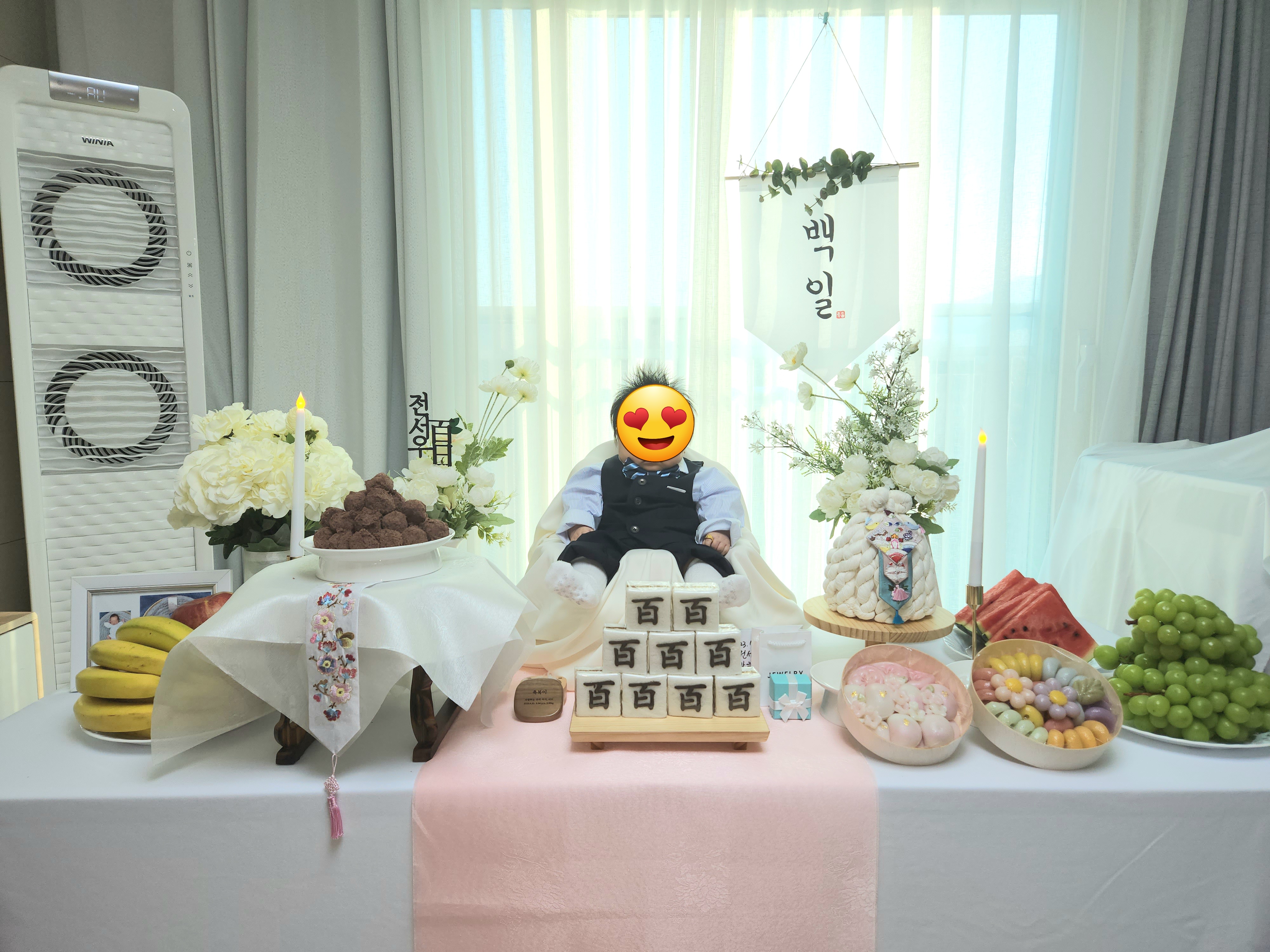 (족자에 얹은 풀이랑 아기 꽃신, 한복 모자(?)는 개인 거에요.)